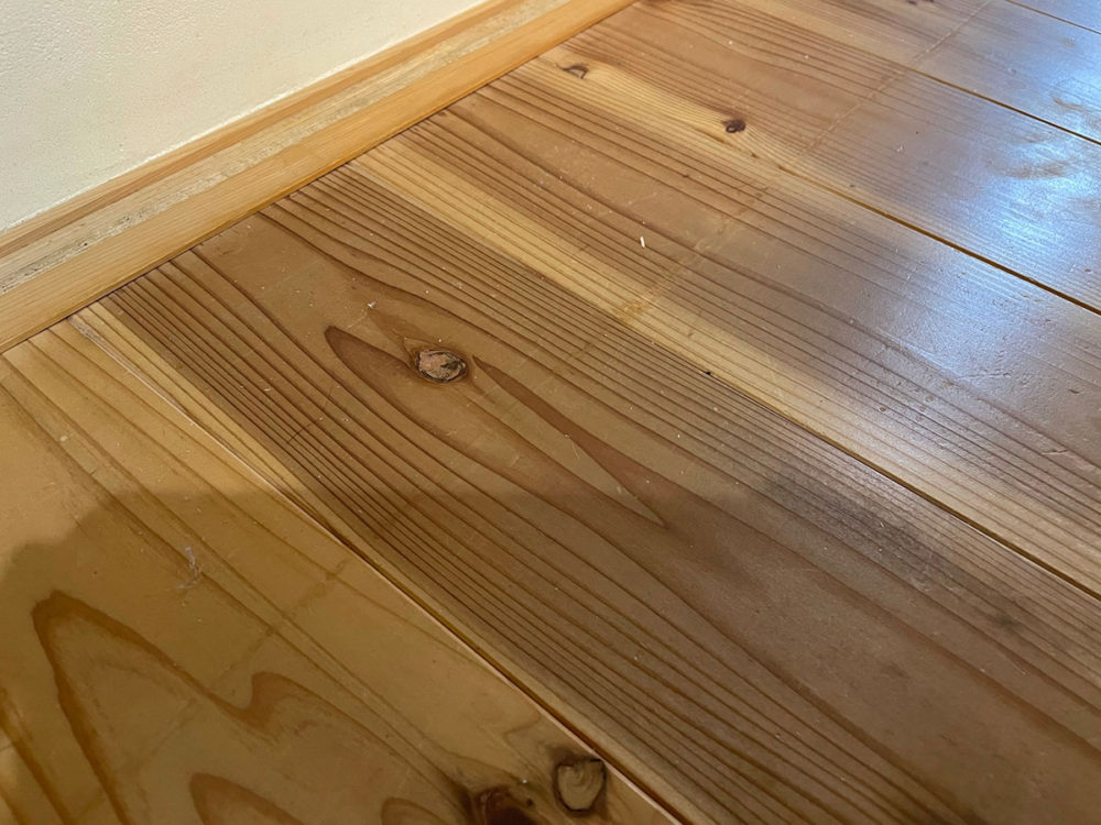 今回の現場では、杉の無垢フローリングに数枚を横断するような線キズが入っており、すでに他の補修業者様がパテ埋めを行っていました。しかし、無垢材にパテを使うと逆に目立ってしまい、部分的な補修跡が残ってしまうことがあります。