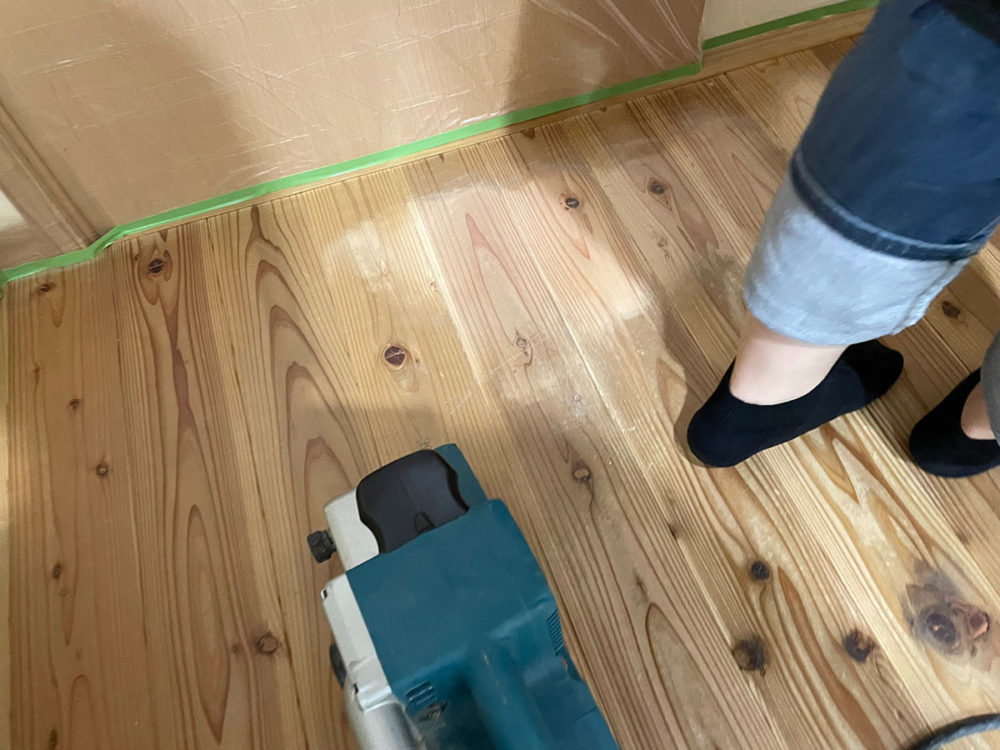 壁際や機械が入りにくい箇所は、マウスサンダーを使って丁寧に研磨しました。これにより、床全体の仕上がりが均一になり、部分補修特有のムラを防ぐことができます。