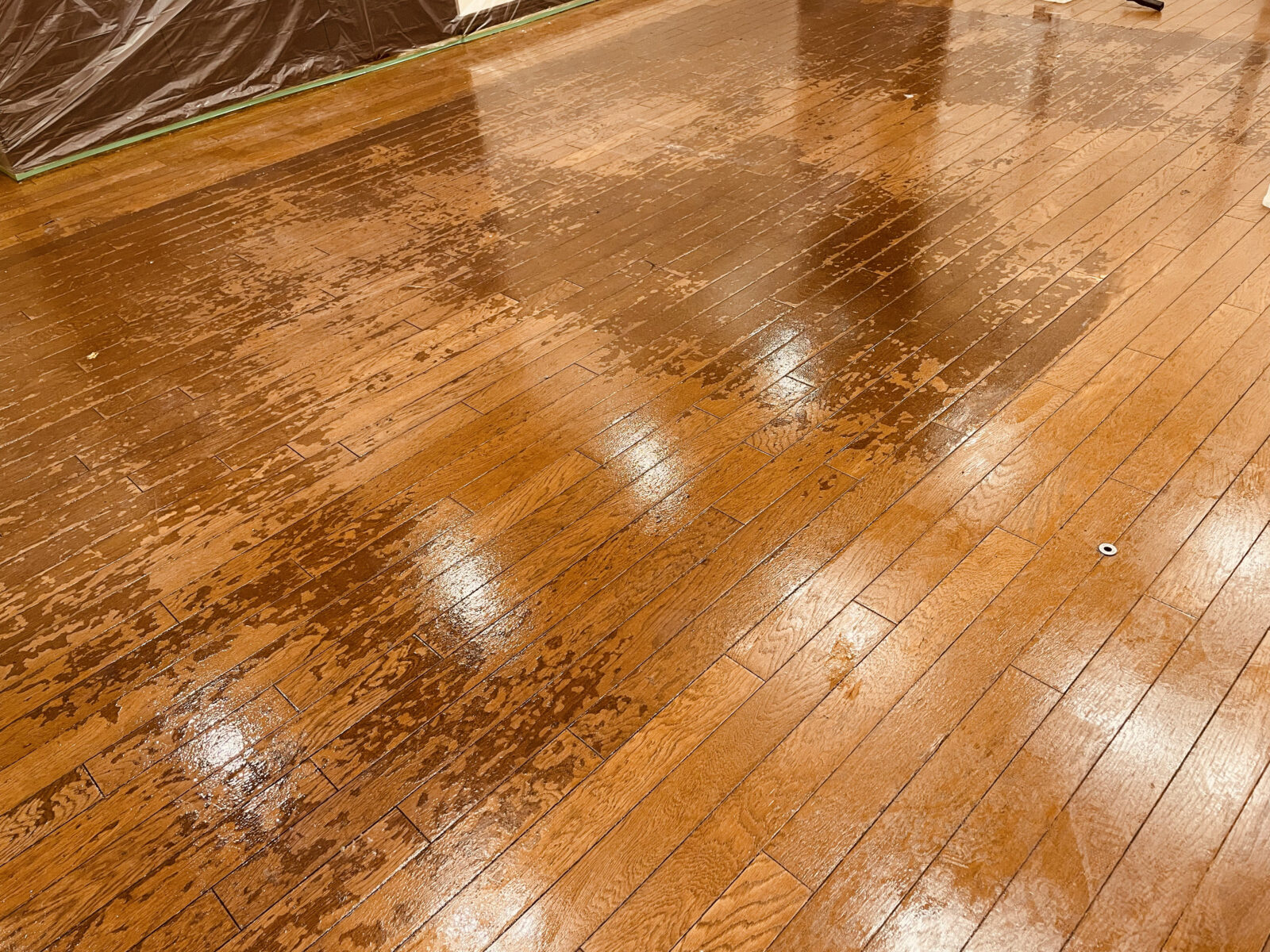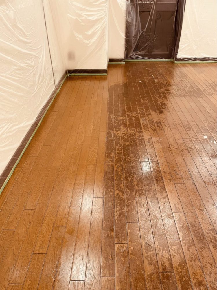 作業の途中段階で、剥離前と剥離後を比較できる部分がありました。片側は黒ずんでムラが目立つ床、もう片側はオーク本来の明るくナチュラルな木肌が現れており、その違いは一目瞭然でした。現場スタッフにとっても大きな励みとなる瞬間です。