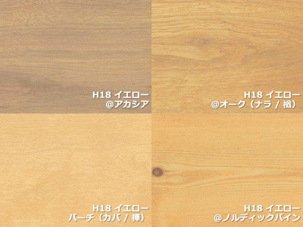屋内外で使用できる純国産自然塗料U-OIL H18 「イエロー」を塗装したらどんな感じになるのか、無垢フローリング専門店の豊富な在庫を利用してアカシア、オーク(ナラ / 楢)、バーチ(カバ / 樺)、ノルディックパインの無垢フローリングのカットサンプルに塗装してみました。