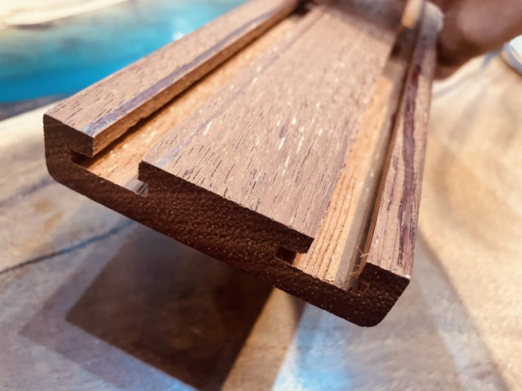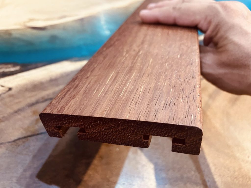 ノンビス工法のデッキ材は色々なタイプがありますが、今回ご紹介するメルバウのデッキ材は裏面にこのようなT字の溝が彫られており、接続金具をカチッとはめ込むだけです。