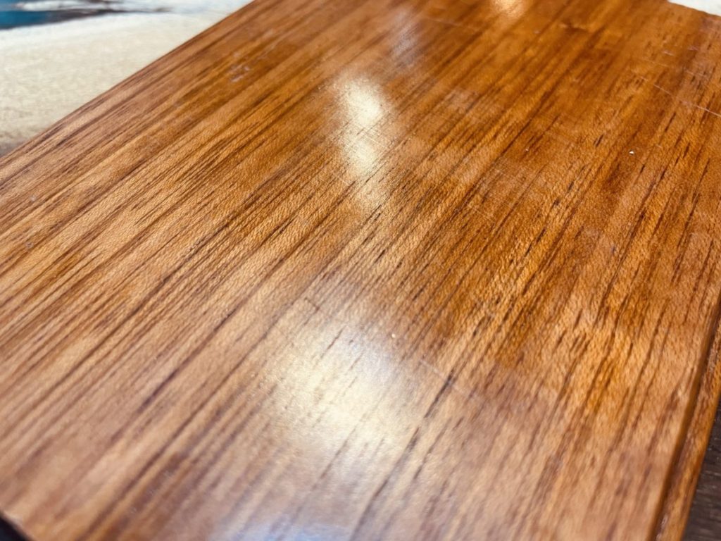 サンプルを拝見した限り、ウレタン塗装済みなのは仕方がないとしても非常に美しく綿密な杢目と上品な赤褐色、昭和から平成初期なら人気があったのでしょう。
