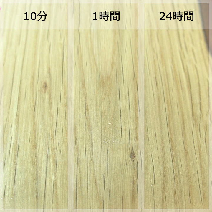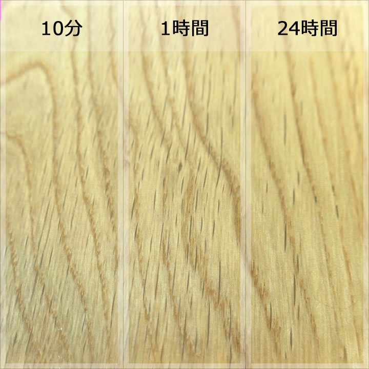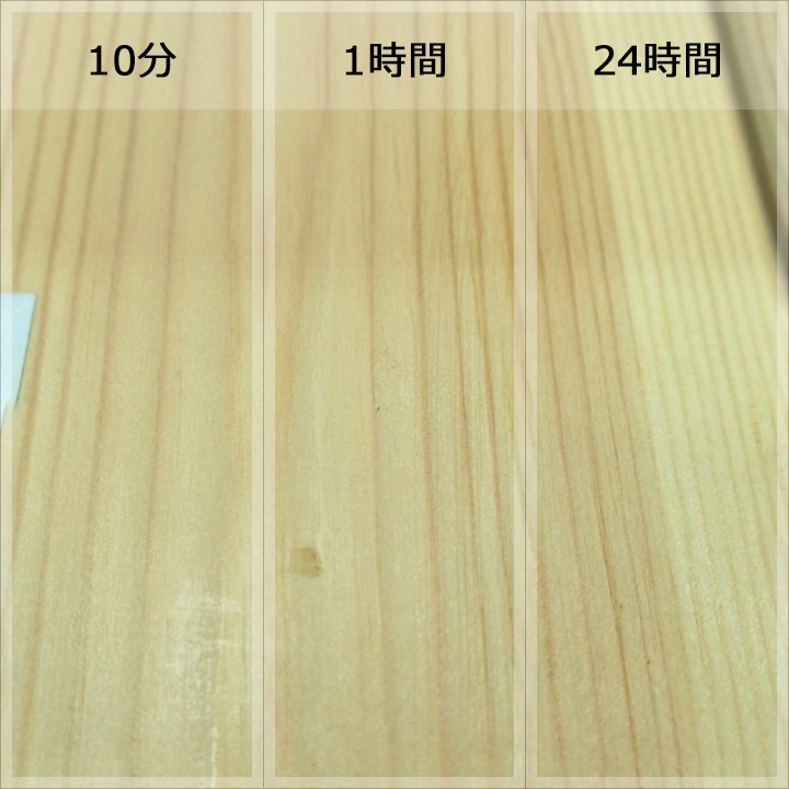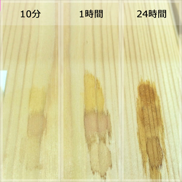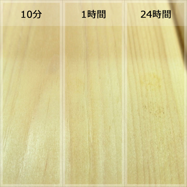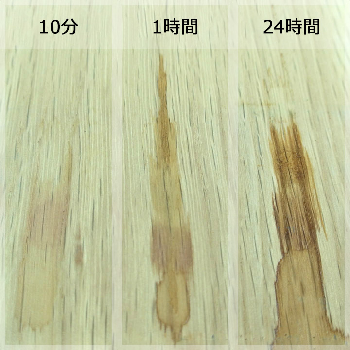 実験内容は各樹種に各塗料を塗装した状態で、コーヒー、赤ワイン、醤油を数滴たらして、10分後、1時間後、24時間後に拭き取ってどのぐらい汚れ跡が残るかで判断します。