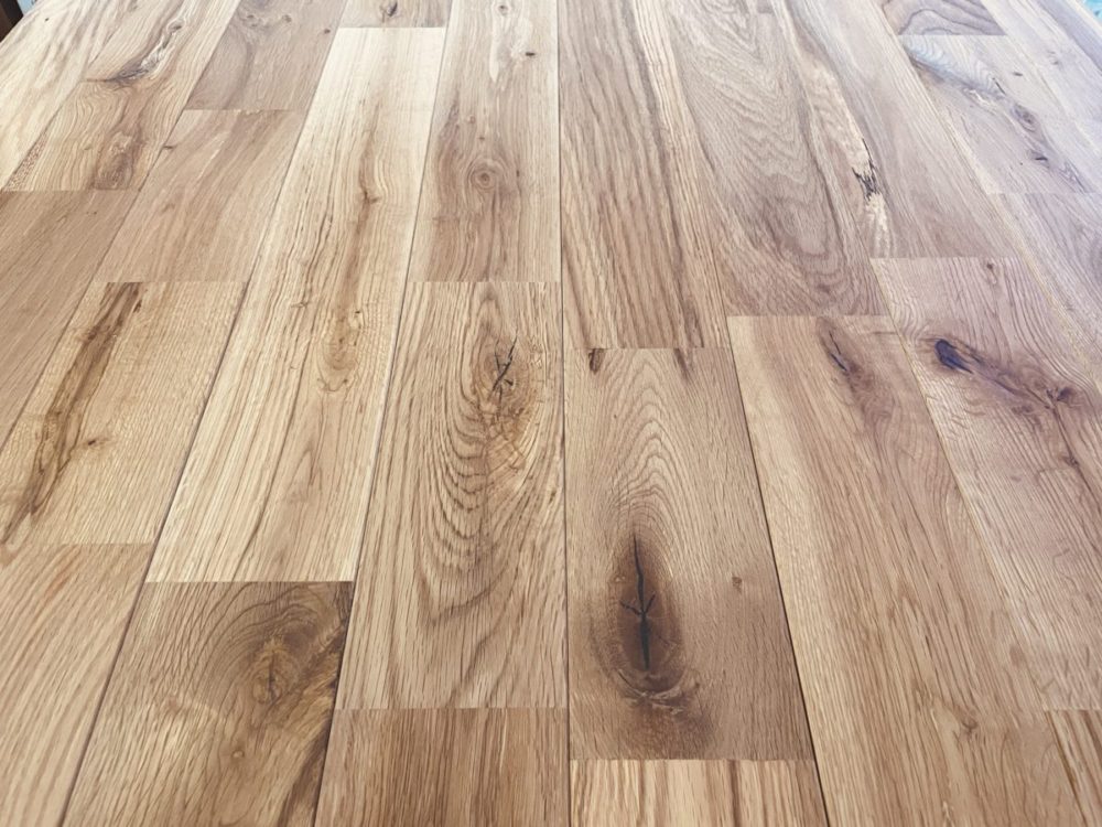 今回施工したのは、オーク(ナラ / 楢)のラスティックグレード無垢フローリングです。もともと明るい黄白色を帯びたオーク材との相性は抜群で、自然な木肌をそのまま引き出すことができました。
