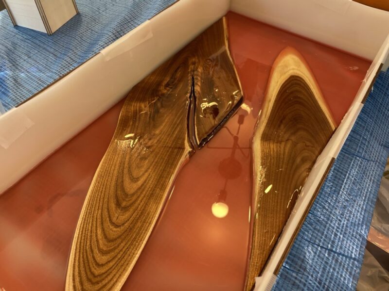 そのため今回は東京のスタッフのみんなにレジンテーブルの作り方からメンテナンスまでしっかり学んで頂くために、実際に木を切るところからレジンテーブルの作成にチャレンジして貰いました。