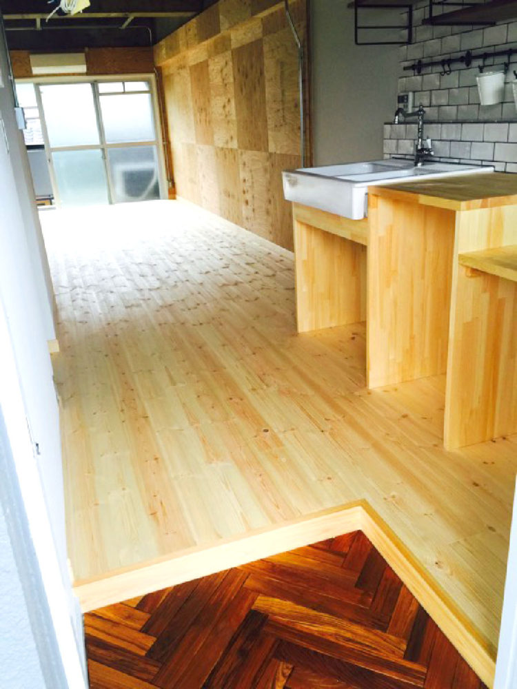 大阪府東大阪市で行われた賃貸マンションのリノベーションでは、「ノルディックパイン 一枚もの 無垢フローリング 15x115x1820mm【ラスティック】無塗装」を採用いただきました。