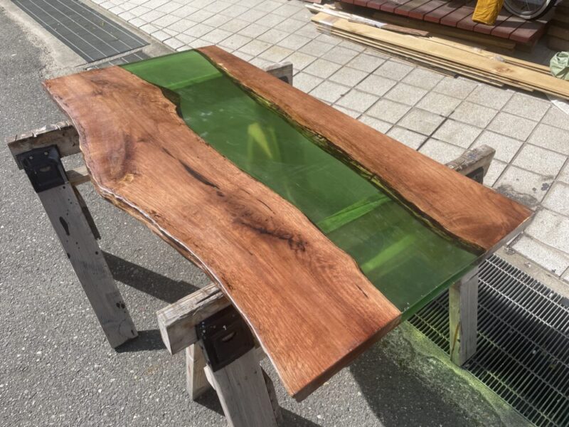 そしてウォルナットにグリーンのレジンを組み合わせたデスクサイズのレジンテーブル。