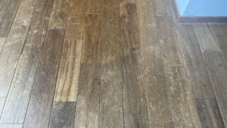熱気ムンムンの室内でジアンウォルナットの無垢フローリングの水シミを消してオスモ #3332 フロアークリアー エクスプレス 3分つやを再塗装しておりますが、粘度の高いオスモを塗るのはまるで筋トレのような作業で、この現場を終えたら一回り大きくなってるんじゃないかと思うほど。