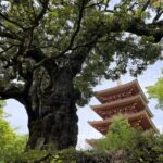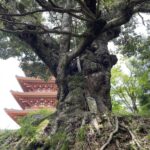 この五重塔は1998年に建てられた新しいモノですが、鎌倉時代の建築様式で作られておりタブノキとの相性も抜群です。