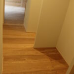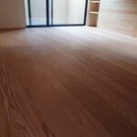 この施工では、アッシュ材の持つ自然な色合いと美しい杢目が、すだれ張りの手法によって際立ち、モダンで洗練された空間が実現しました。また、150mmの幅広フローリングは、部屋全体に広がりと統一感をもたらし、居心地の良いリビングスペースを演出しています。