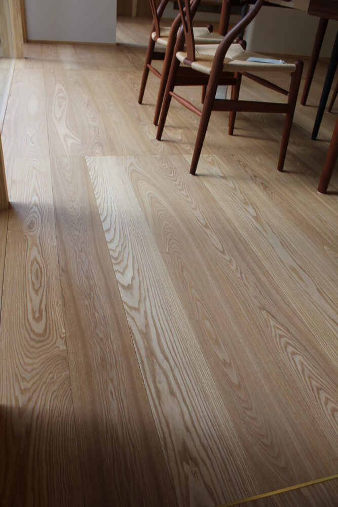 中でも、アッシュ(タモ)材の150mm幅一枚もの複合フローリングは、その美しい杢目と高級感から多くの方に選ばれています。