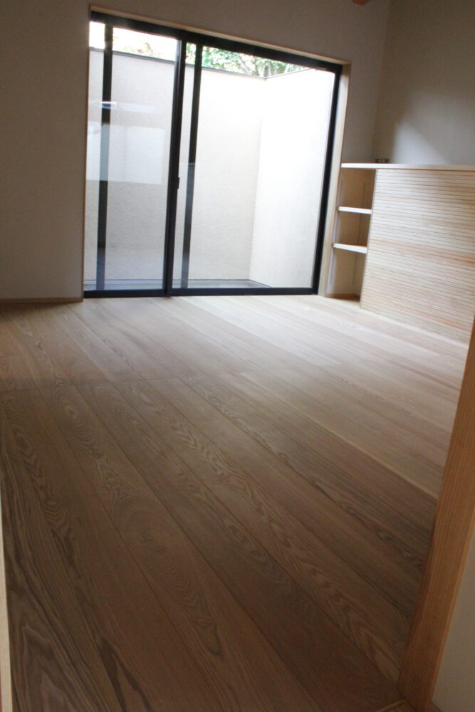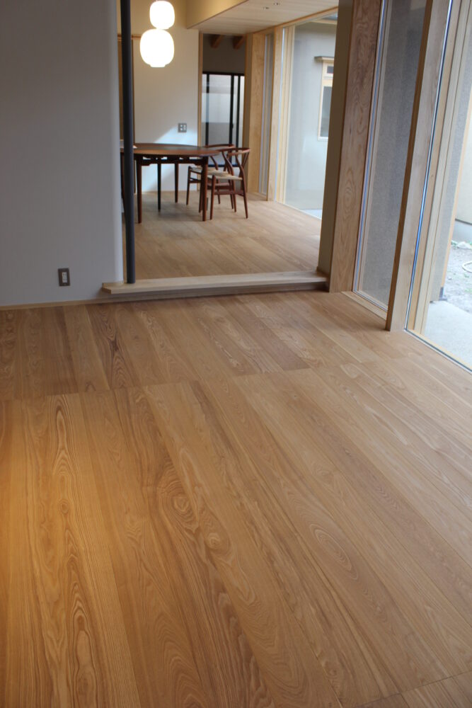 実際の新築一戸建てにおいて、アッシュ材の150mm幅一枚もの複合フローリングをすだれ張りで施工した事例をご紹介します。