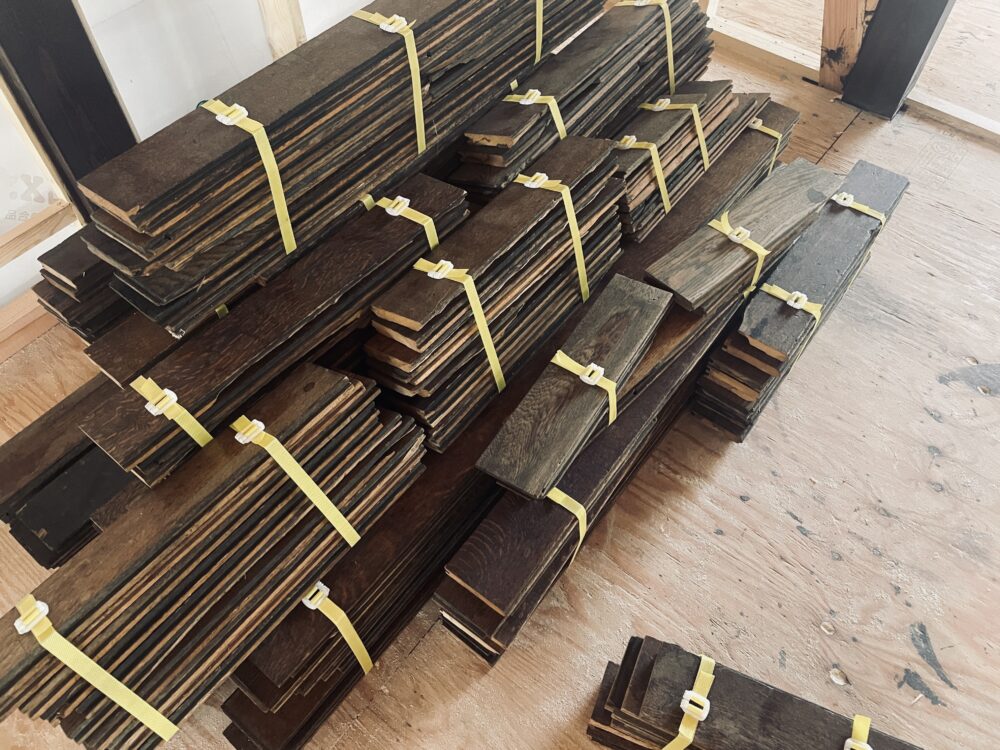 明日の朝からこのオーク(ナラ / 楢)の古材無垢フローリングを施工開始致しますが、右肩を故障してしまい焦っております。