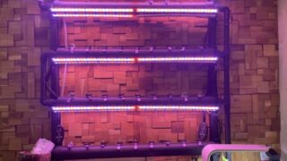 エコロキアの水耕栽培システムは水槽の水をポンプでくみ上げてパイプの中を水が循環するような仕組みになっており、そこにタイマーで作動する植物育成ライトが夜になると煌々と光り輝きます。