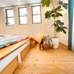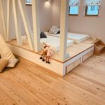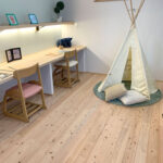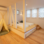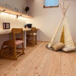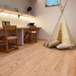 今回のモデルハウスでは、子供部屋に奈良県産吉野杉一枚もの無垢フローリング(15×112×2000mm 無塗装)を採用しました。壁面には二人分の学習机や遊び心をくすぐるテント、小上がりのベッド下には収納スペースを設けるなど、機能性とデザイン性を兼ね備えた空間となっています。