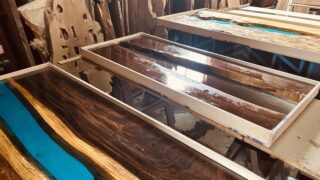 石見赤松の上品で力強い杢目がエボニーで塗装をしたことで美しく明瞭になって、非常に格好良くなりました。
