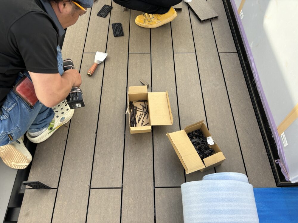 今回は弊社が取り扱っている人工木ではなく、支給された他社の人工木を施工させて頂きました。