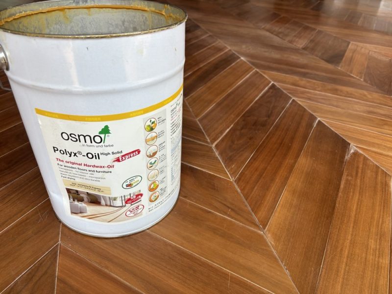 お住まいになりながらの場合、乾く時間が非常に重要なので速乾性のオスモ フロアークリアーエクスプレスをチョイス。