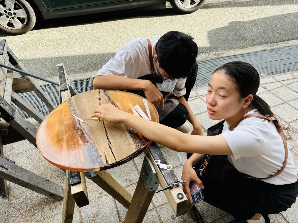 昨日に引き続き、中学生のレジンテーブル体験会で本日は表面の研磨と組み立て。