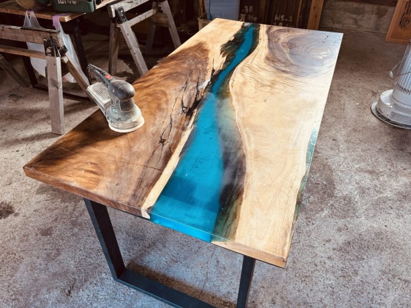 研磨で綺麗に生まれ変わったモンキーポッドのレジンテーブル。