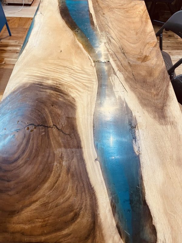 エコロキアの本社で長年使用してきたモンキーポッドのレジンテーブル。
