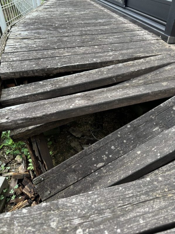 ネジや金具が緩むと、デッキが不安定になり、崩壊や怪我の原因になります。また、見えない部分で木材が腐敗していることも。