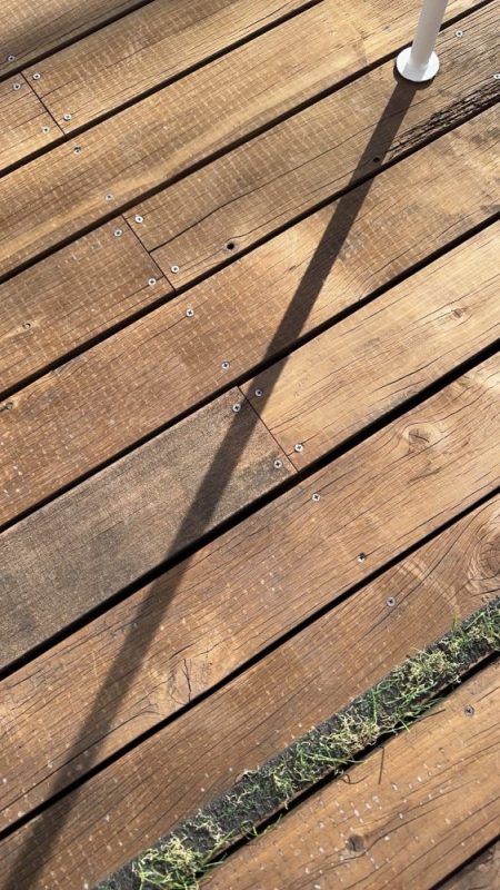 経年による劣化が見られますが、防腐剤処理のみの杉材としては比較的よく持ちこたえた印象です。