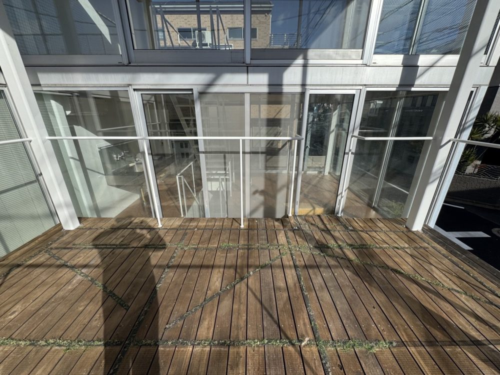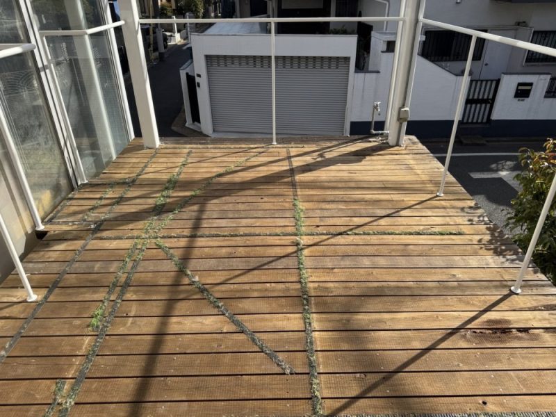 因みに現状ですが、もともとこのルーフバルコニーでワンちゃんたちを遊ばせていたとのこと。その影響でデッキ表面は傷み、人工芝を貼っていた両面テープが取れなくなっている部分も多く見受けられました。