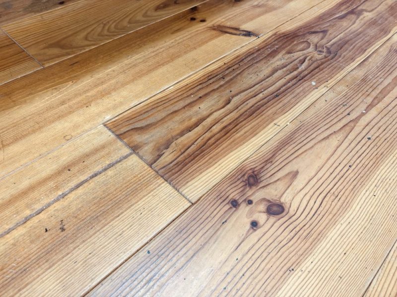 針葉樹といえば「ソフトウッド」と呼ばれ、その名の通り柔らかい、傷つきやすいというイメージが強いですから。「あぁ、毎日この床に悲しい溝が刻まれていくのだろうな」と予想しており、ある程度酷くなったら研磨して再生するネタのひとつにでもなるだろう…と思っていました。