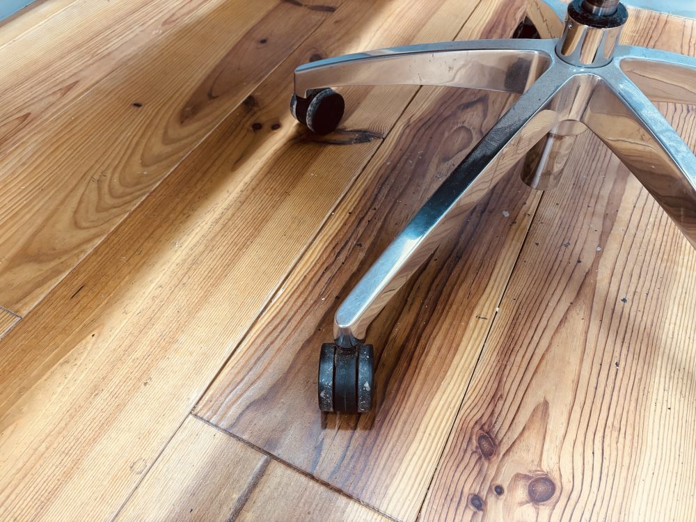 キャスターの動きと僕の体重を受け止めているボルドーパイン無垢フローリング。