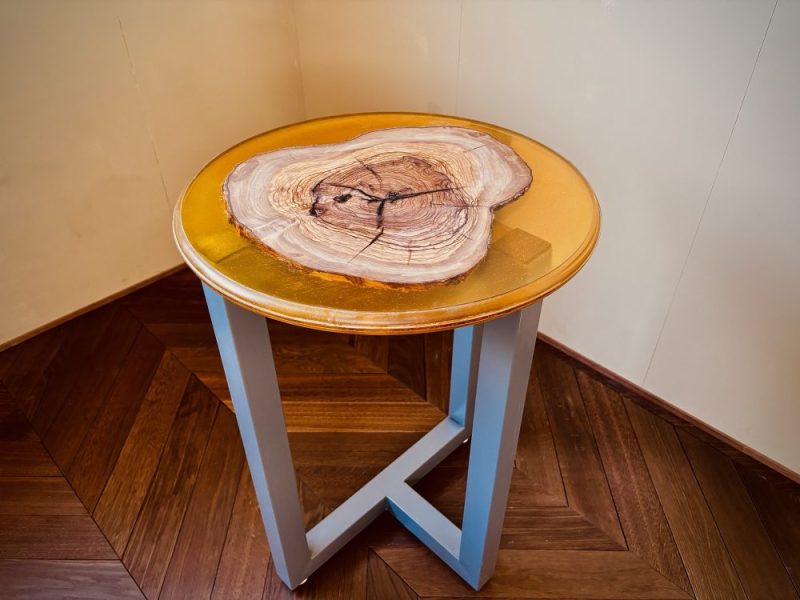 オリーブの丸太を引き立てるため、周囲にはアンバー(琥珀色)のレジンを用いました。