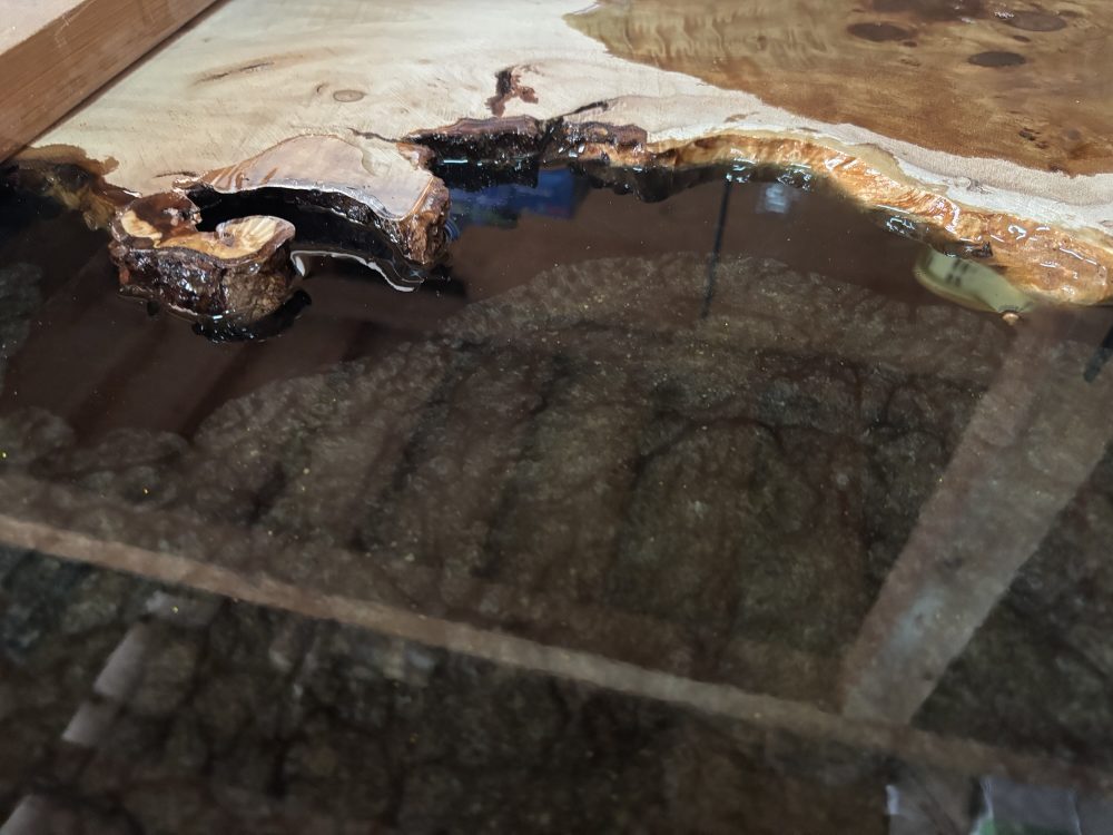 レジンが完全に硬化したあとは、粗削りから細かいサンディング、最終塗装までを丁寧に実施。ポプラの木肌とレジンのコントラストが際立ち、非常に高級感のある仕上がりになりそうです。