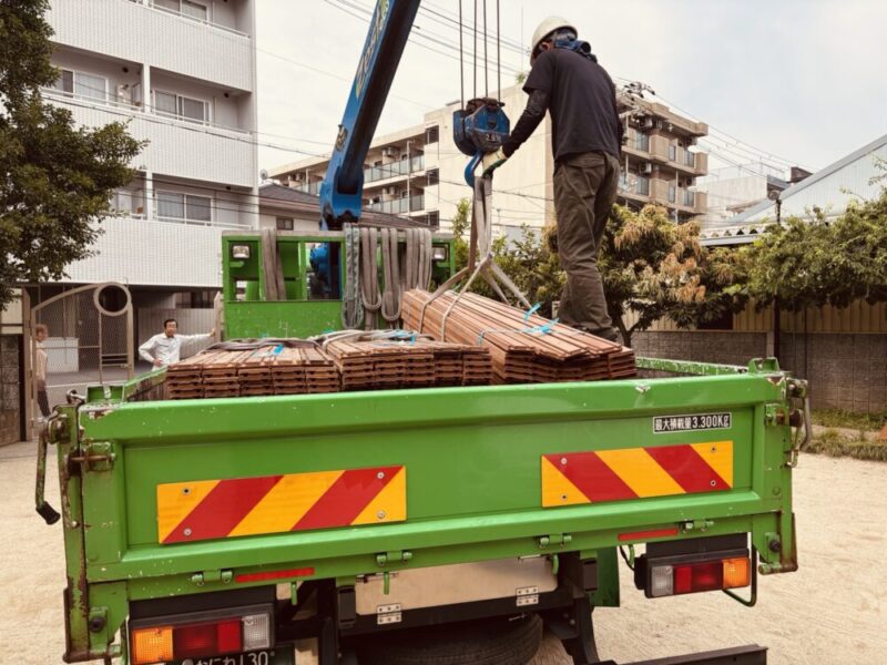 今回納品したメルバウは非常に硬く重い材です。1枚あたりでも相当な重量があるため、手降ろしには限界があります。クレーンによってまとめて降ろせることで作業者の負担を軽減し、短時間での納品が実現できました。