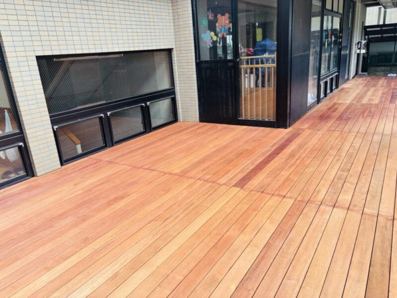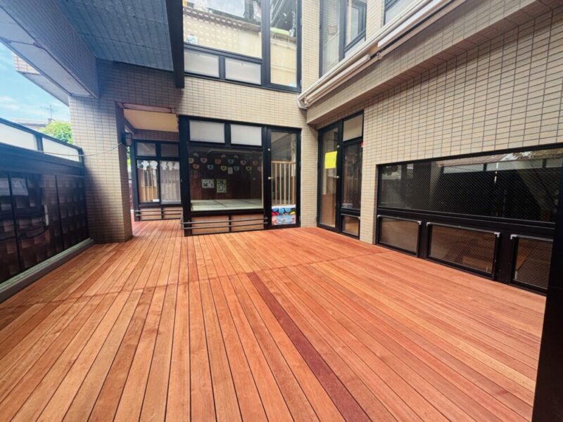 今回施工させていただいた保育園のウッドデッキは、メルバウ材の高耐久性とノンビス工法の美観・安全性が融合した、理想的な仕上がりとなりました。さらにアク止めシーラーを塗布することで、施設利用者様への配慮も万全です。