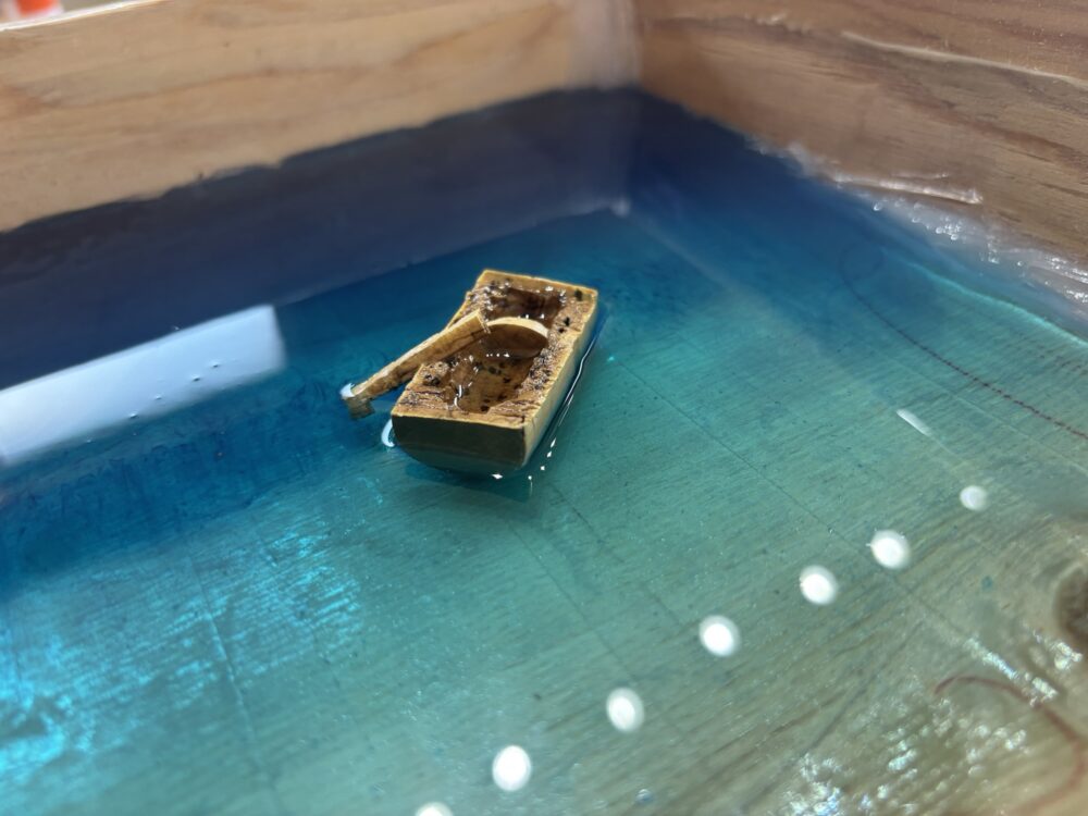 その出来栄えはまさに驚きで、手作りとは思えない精巧なミニチュア。しかも、ちゃんとオールまでついていて、レジンの上にそっと置かれると、そこに物語が一気に生まれるのです。