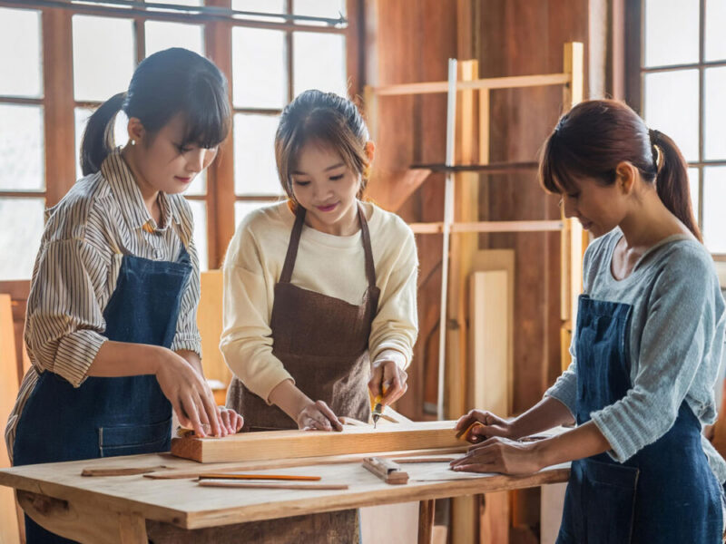 レジンテーブル制作は、木材選び→型枠作成→レジン流し込み→研磨→塗装→完成という最短4回構成の工程を、全員で協力して進めていくプロセスです。