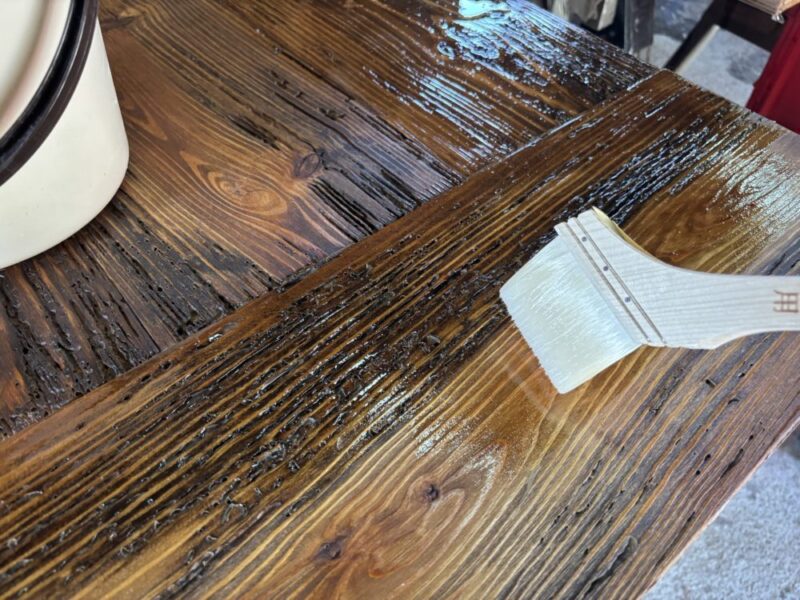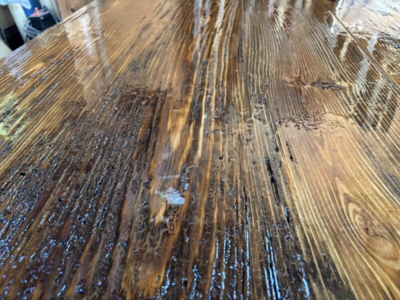 レジンは透明性が高く、下地の木目や色合いをそのまま活かすことができます。今回のように濃色のオイルステインと組み合わせることで、まるで飴細工のような光沢感が生まれました。