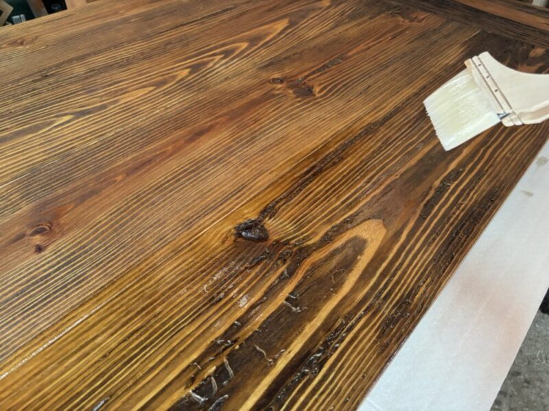 通常、テーブル製作では表面を均してから塗装しますが、今回はあえて“目止め”を行わず、凹凸を活かしました。その結果、木目と虫食い跡が織りなす自然な凹凸が立体的に浮かび上がり、非常に魅力的な表情となっています。