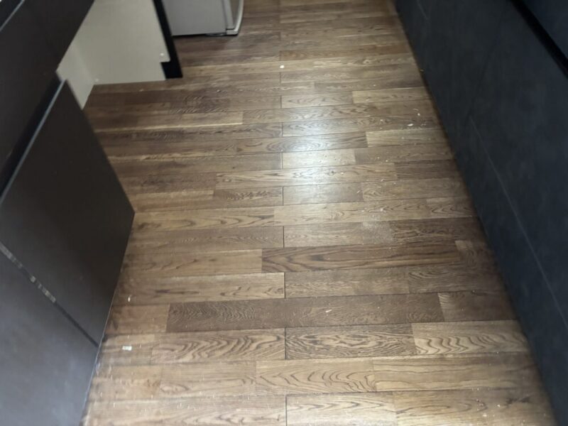 施工前のオークフローリングは、黒いオイル塗装により全体が暗く沈んだ印象でした。