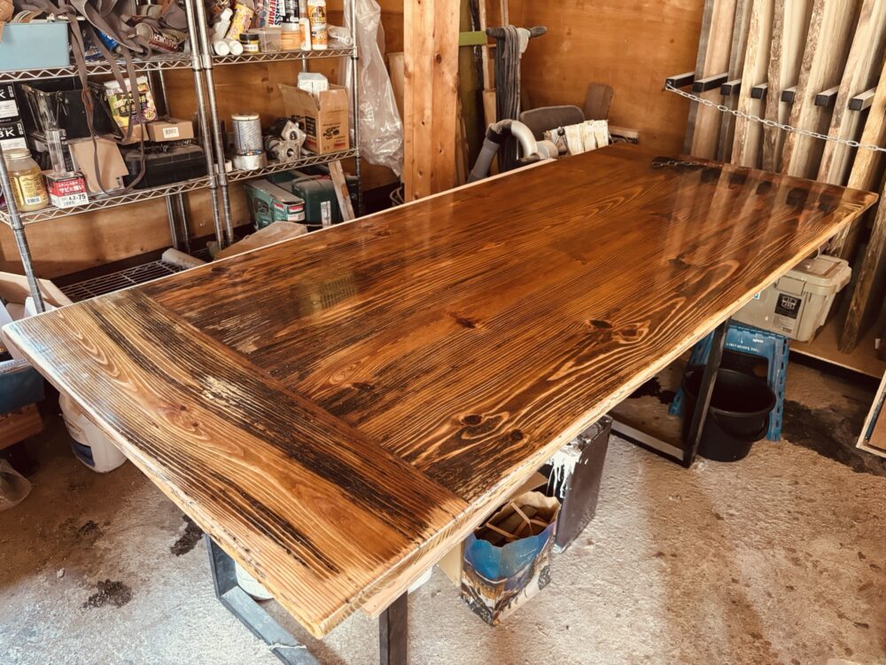 完成したテーブルの美しさは、一見ワイルドで自然任せに見えながら、実際には高度な職人技と時間をかけた作業の結晶です。