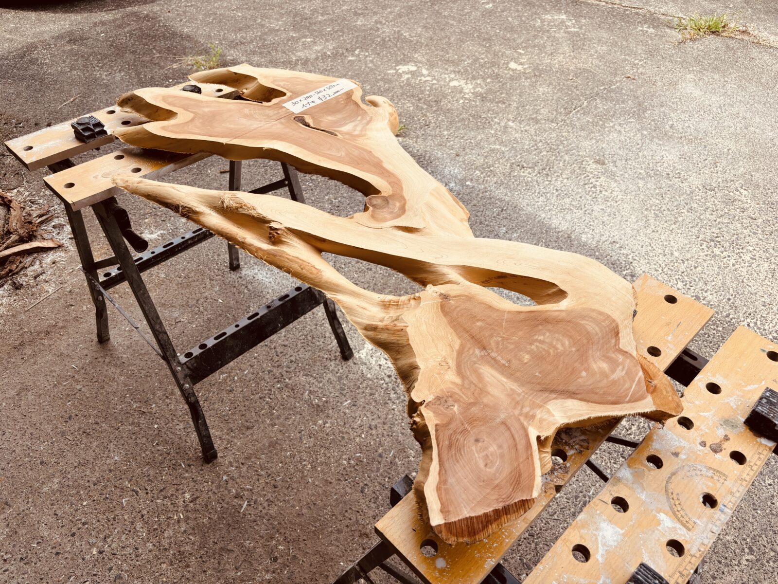 庭木や生垣としても知られる針葉樹ですが、板材になるとその独特の色合いや杢目が美しく、個性的な表情を持っています。重量感もあり、「針葉樹=軽い」というイメージを覆す存在です。レジンと組み合わせれば、他にはない独創的なテーブルが仕上がるでしょう。