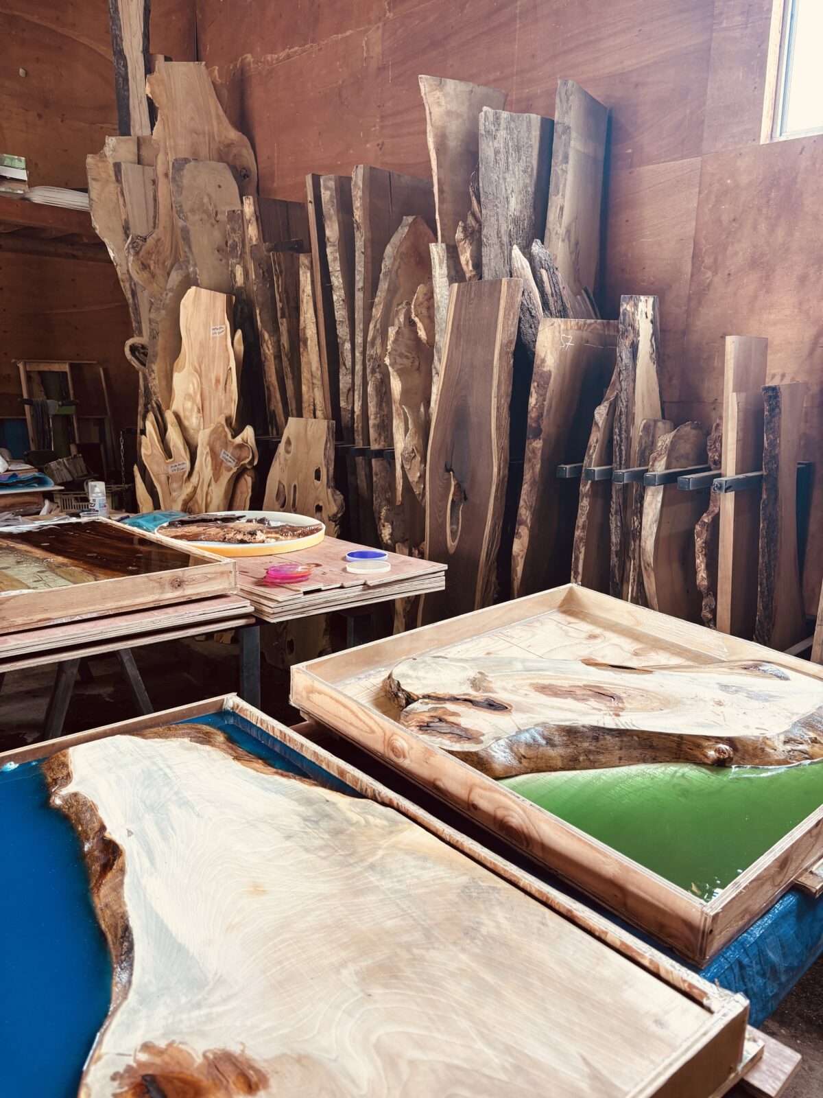 レジンテーブルの魅力は、木材の個性と透明感ある樹脂が掛け合わさることで生まれる独特の美しさです。節や割れ、空洞のある板こそ、レジンとの相性が抜群。アトリエの在庫を改めて見渡すと、「これはブルーのレジンで海をイメージできそう」「この割れ目にクリアを流せば、まるで川のようになる」といったアイデアが次々と湧いてきます。