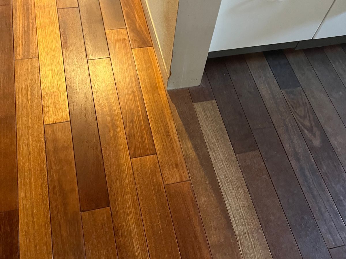 キッチン横の花梨無垢フローリングを研磨前後で比較した様子