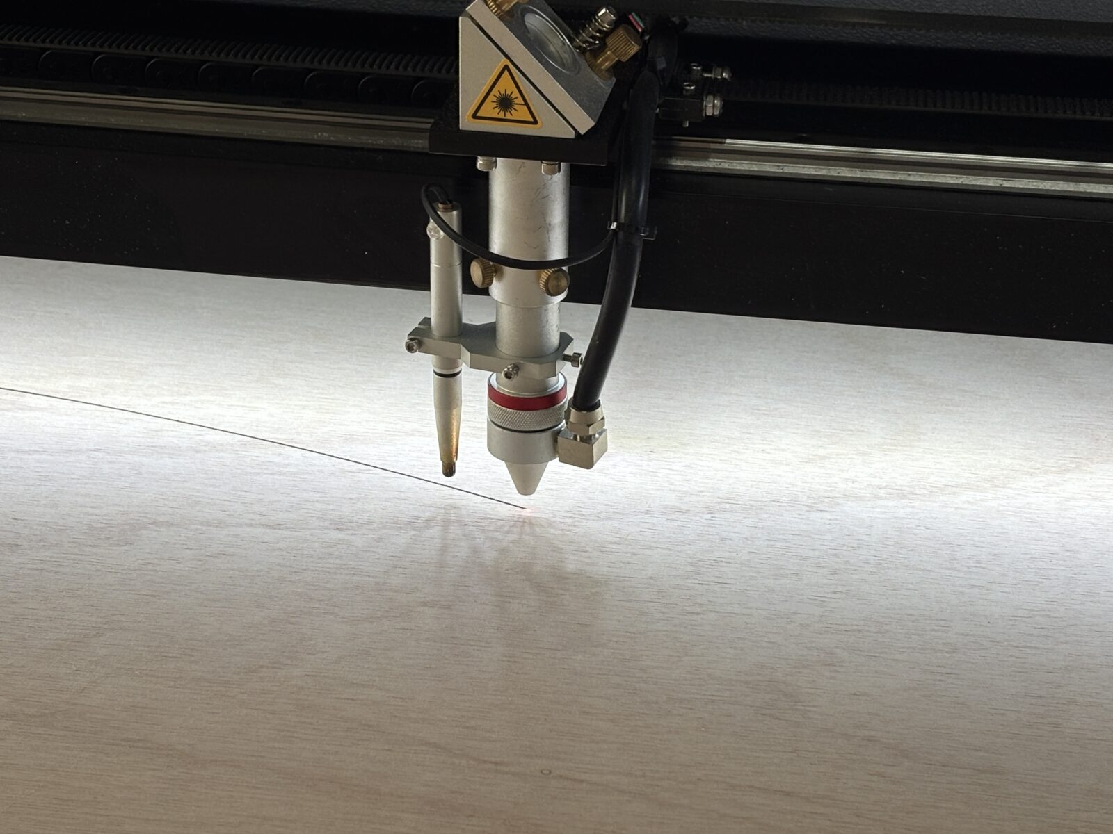 まず取り掛かったのは、レーザー加工機による琵琶湖型の切り出しです。レーザー加工機の魅力は、なんといってもその精度の高さにあります。複雑で入り組んだ琵琶湖の湖岸線を正確にトレースし、細部まで美しく再現できるのは、手作業では到底難しい領域です。加工中の赤いレーザー光が木材表面を走る様子は、まるでデジタルとクラフトが融合する瞬間のようで、見ているだけでもわくわくします。