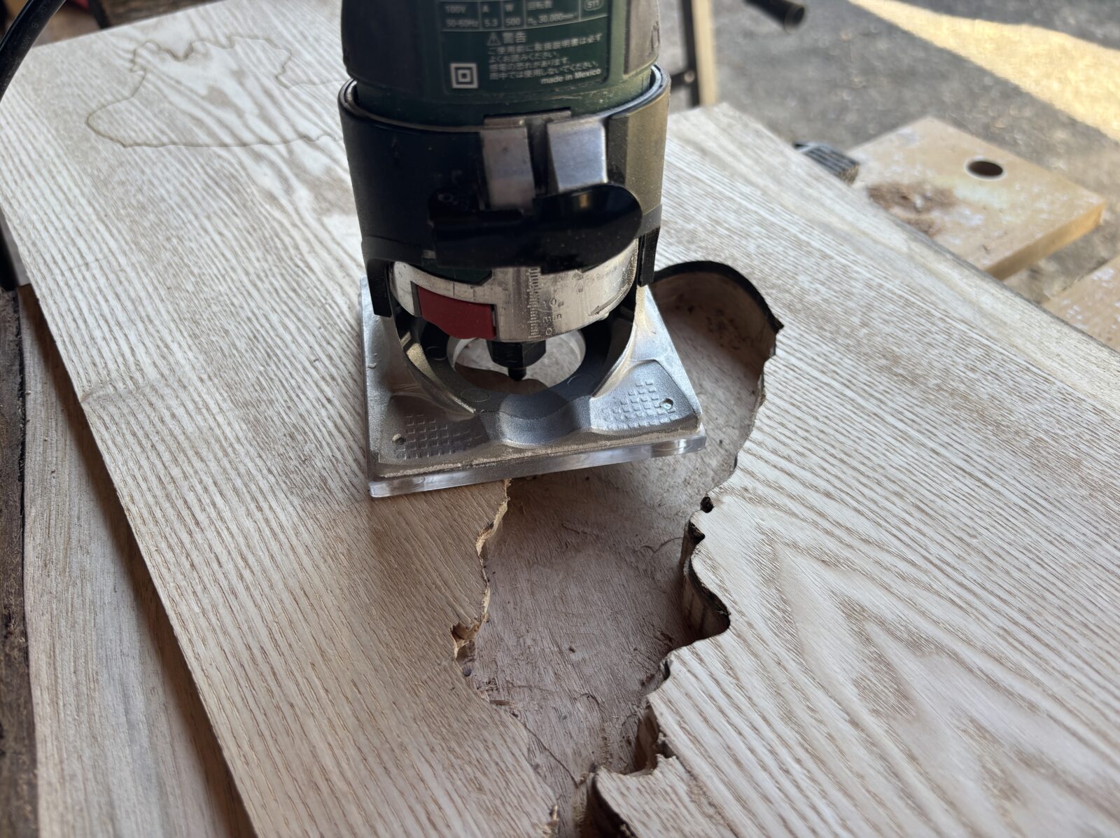 トリマーで胡桃材を彫り込む工程