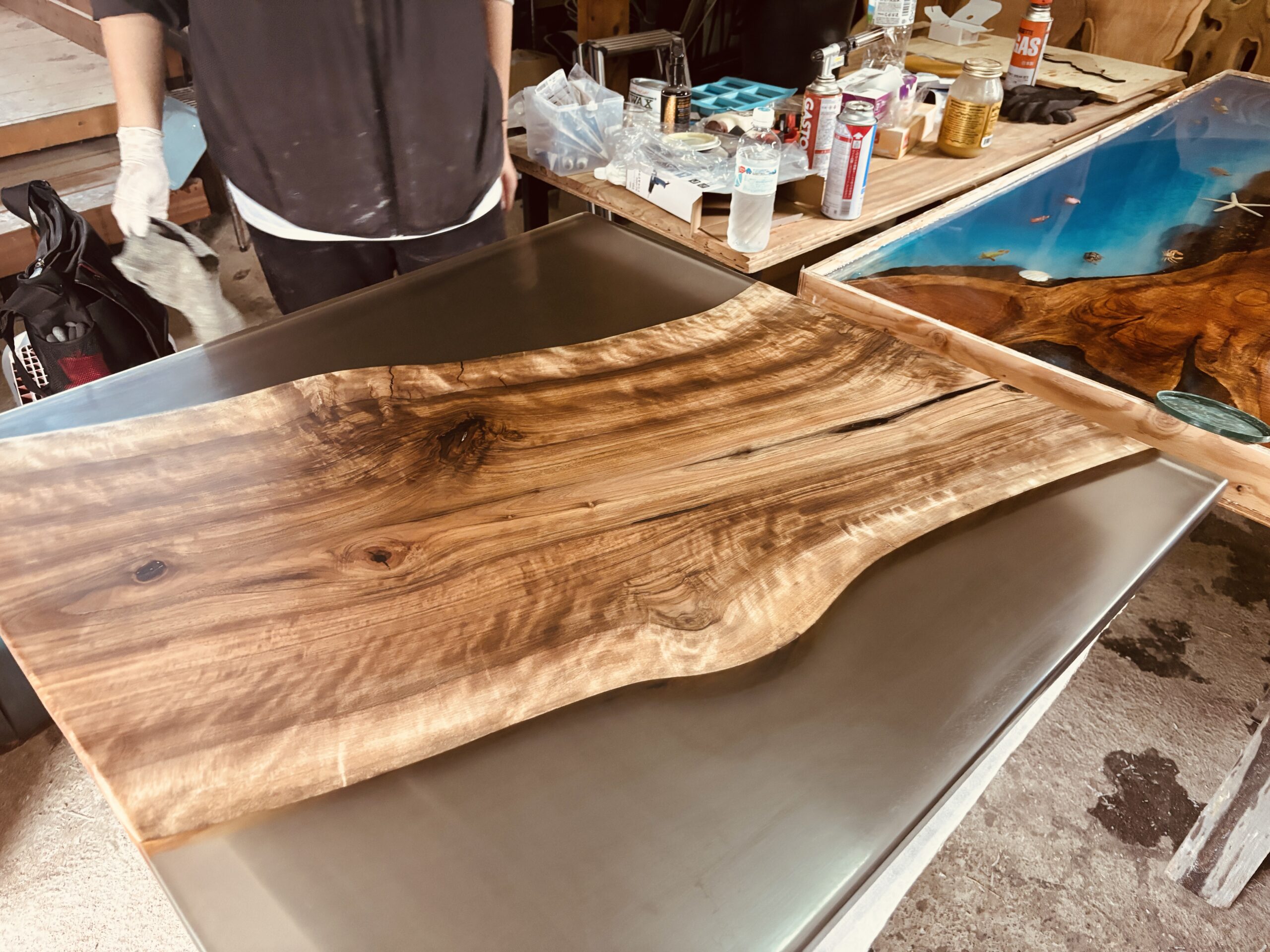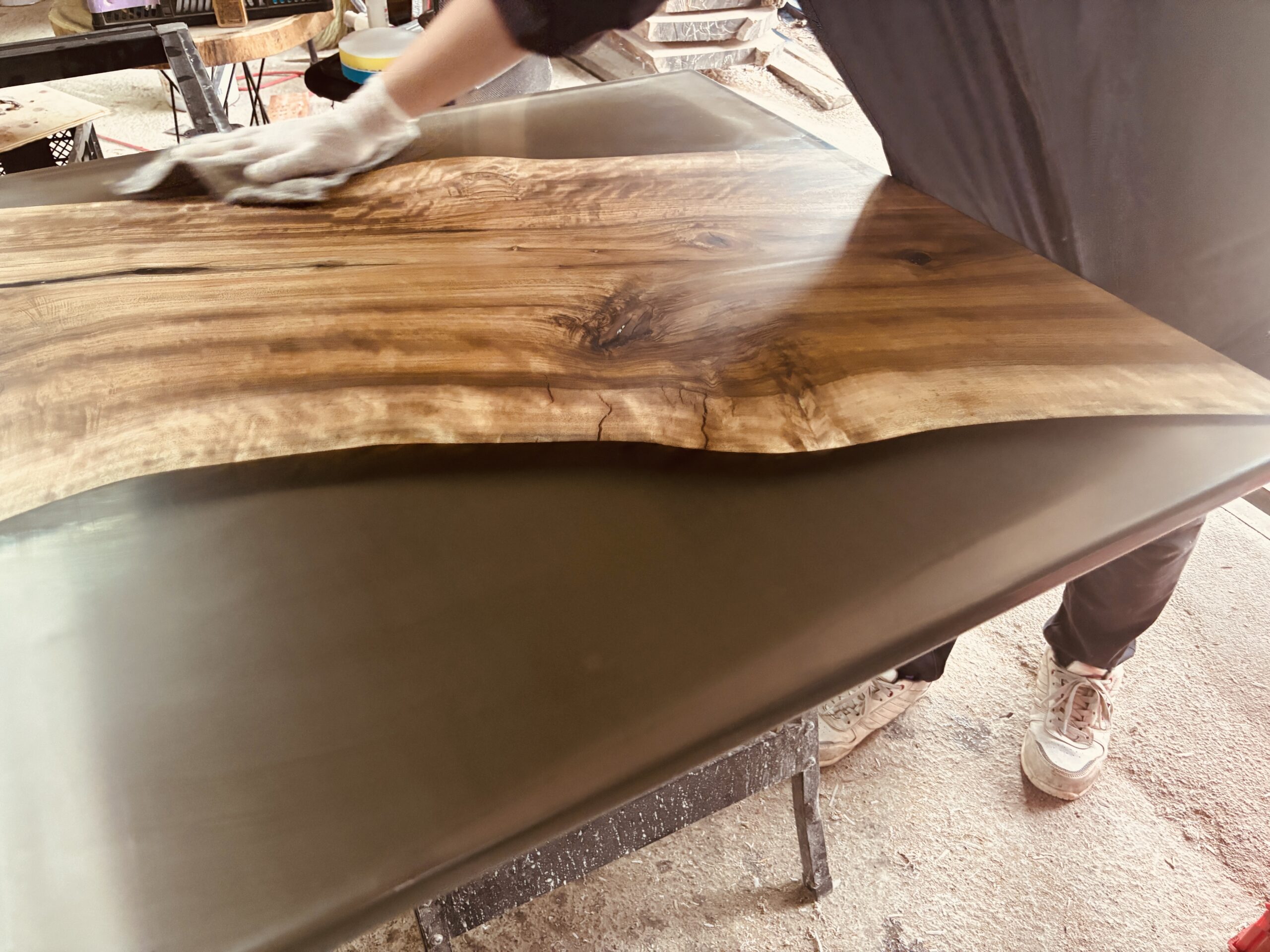 今回のように、ブラックウォルナットとグレーのレジンを組み合わせたテーブルは特に難易度が高い素材です。木の柔らかさとレジンの硬さが違うため、研磨の力加減を少しでも誤ると面が波打ってしまう。さらに、グレーのレジンは光の反射で微細な傷が非常に目立つため、完璧な仕上げが求められます。