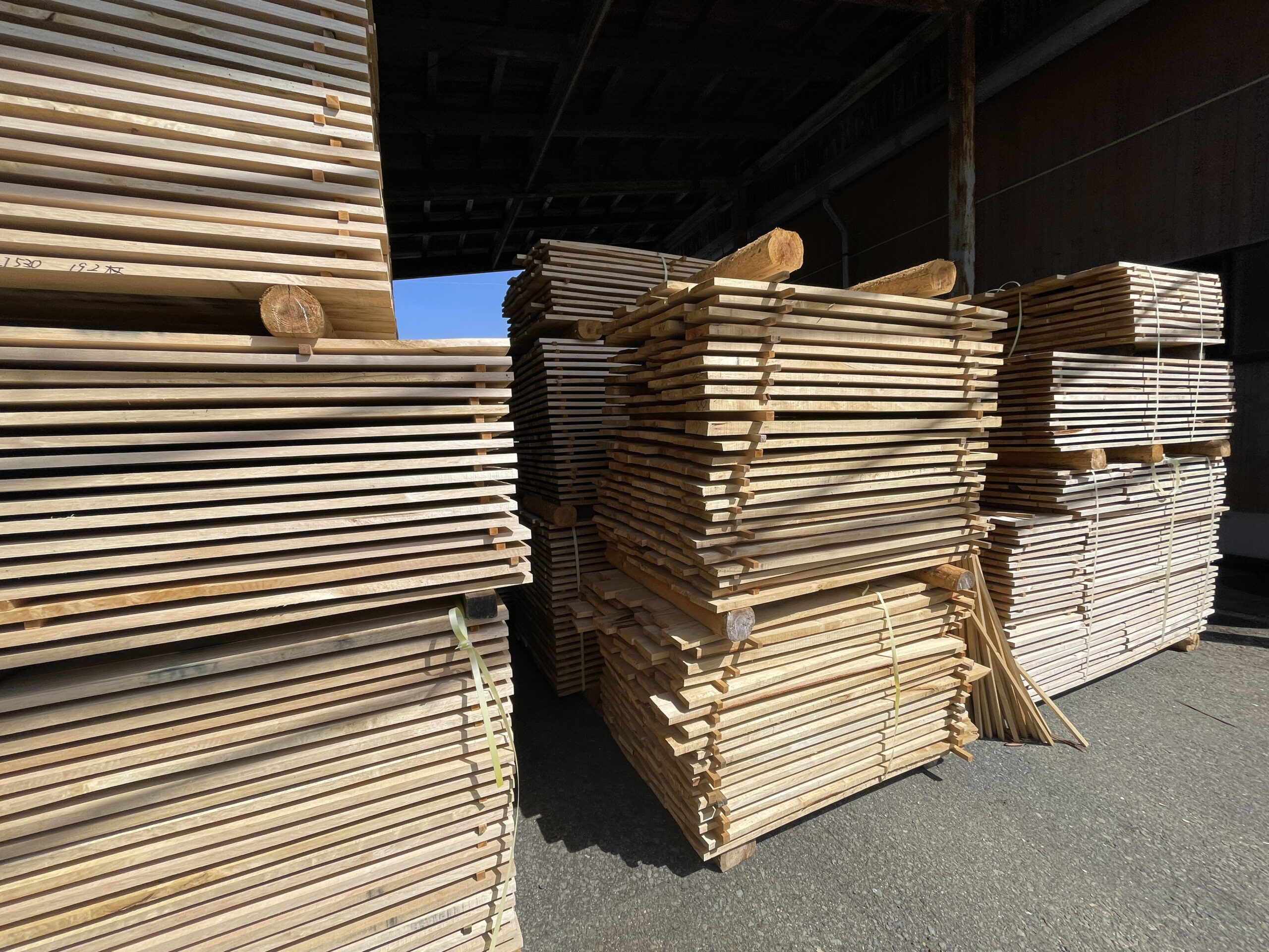 木口の表情や桟木の厚み、積層の整い方がよく分かり、乾燥工程の丁寧さを感じられる写真です。
