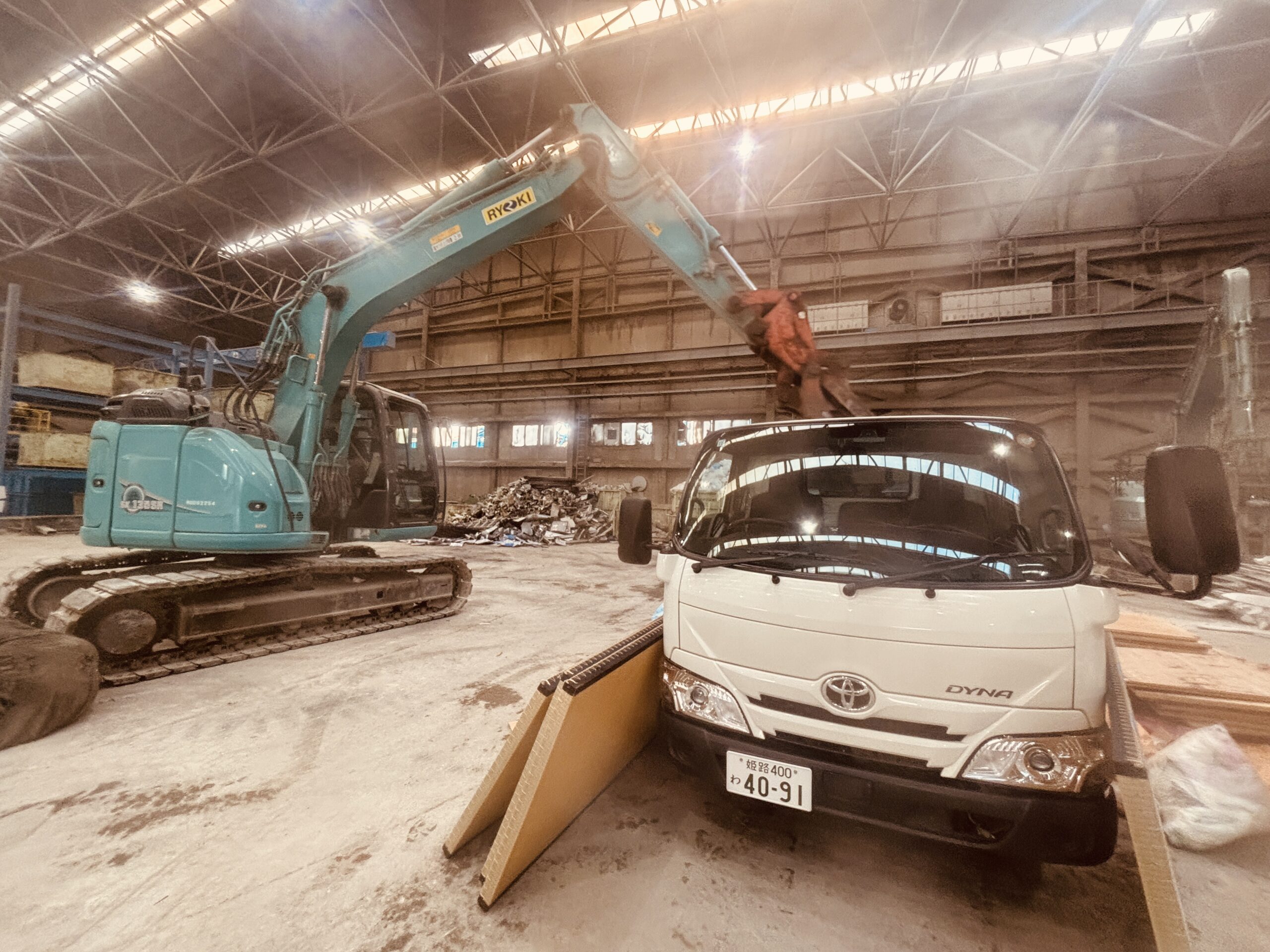 エコロキアでは無垢フローリングの施工や研磨補修(ムクリペ)、レジンテーブル制作など、木材を扱う作業が多く、現場が重なると解体材や端材が一気に増えていきます。