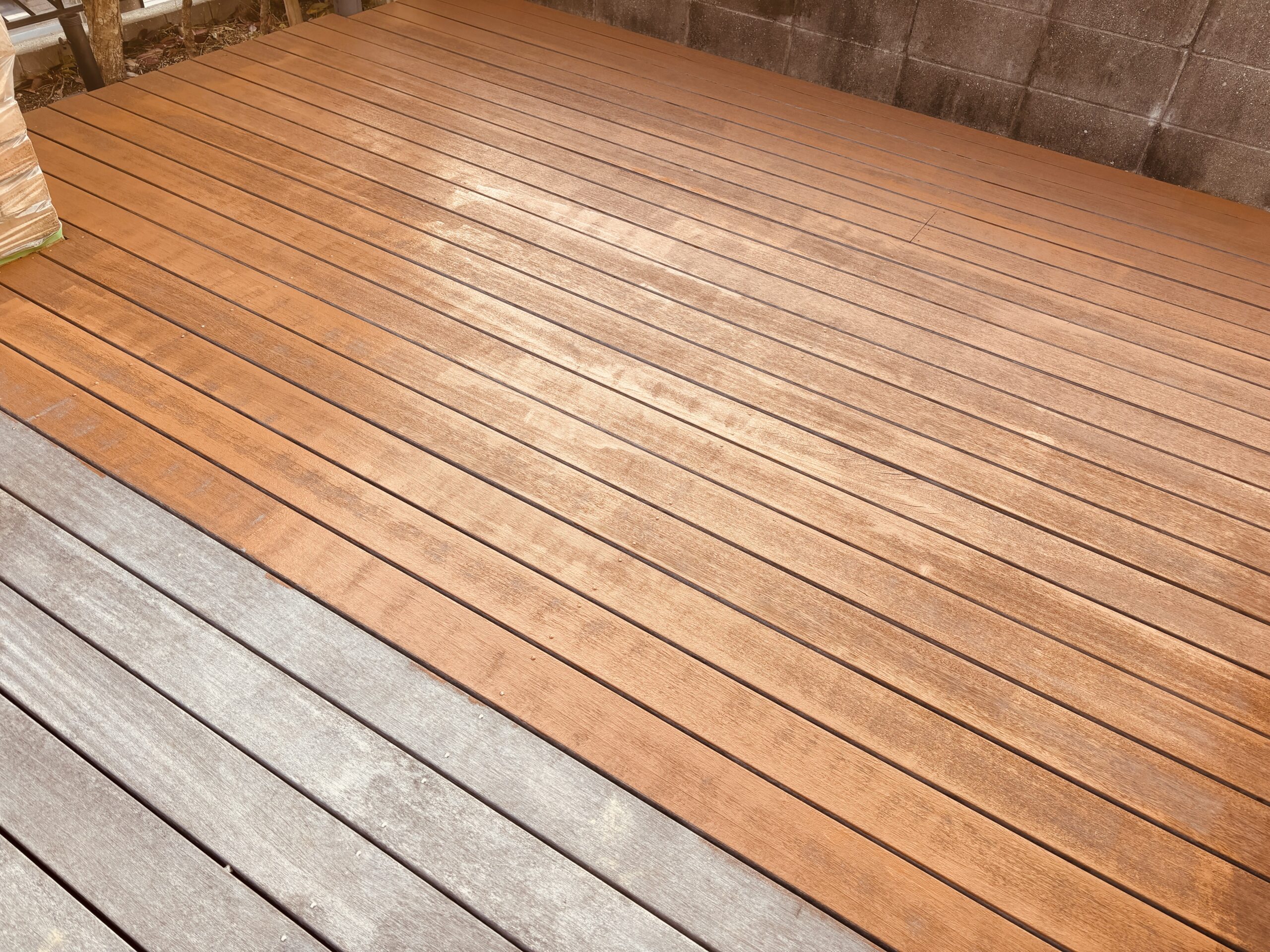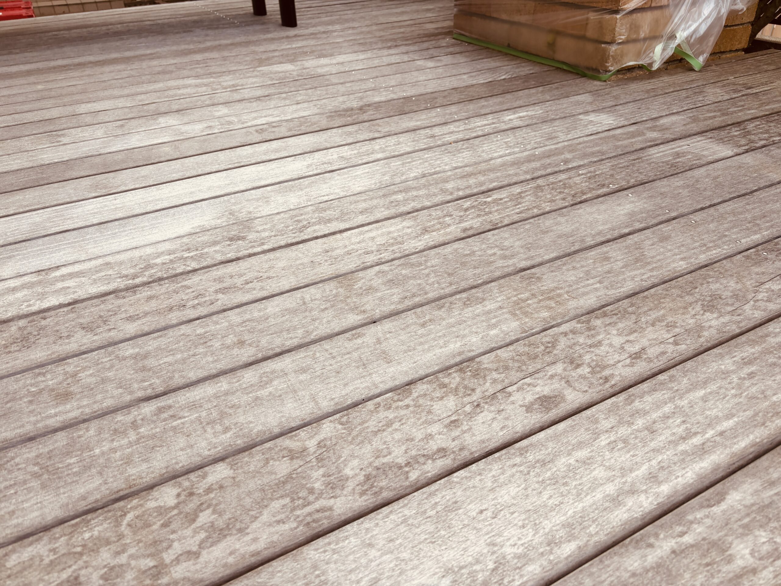 施工から年数が経過し、全体的に白銀化が進んだ状態で、「見た目がかなり白っぽくなってきた」「素足で歩くと少しササクレが気になる」といったお悩みをお持ちでした。