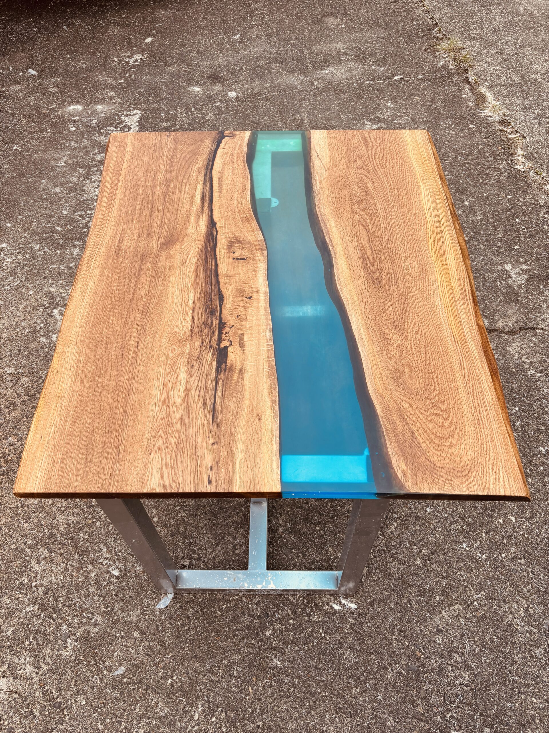 一方で、レジンテーブルという視点で見ると評価は逆転します。センターにレジンを入れる前提であれば、両耳を残せる細身の板は理想的。